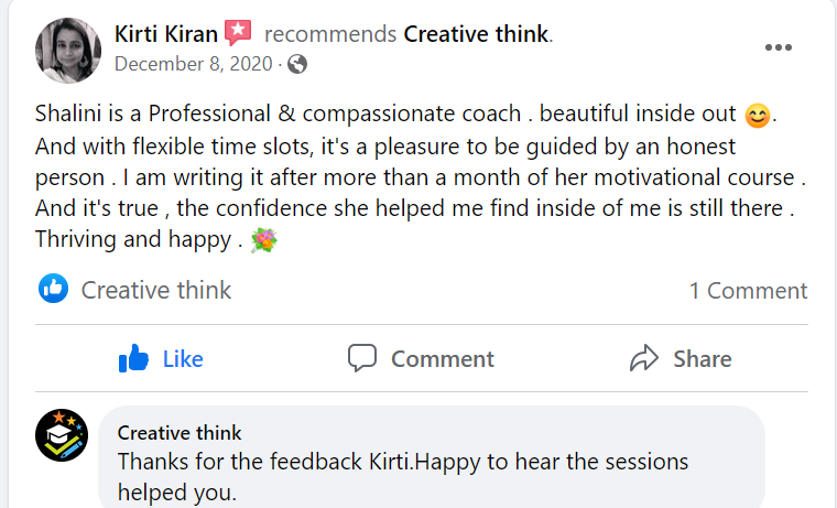 Creative Think is an online platform based in Bangalore offering customized training programs, content solutions, and well-being training and tools for individuals, corporates, and academies. We at Creative Think focus on building actionable skills, reducing stress, and promoting self-growth.